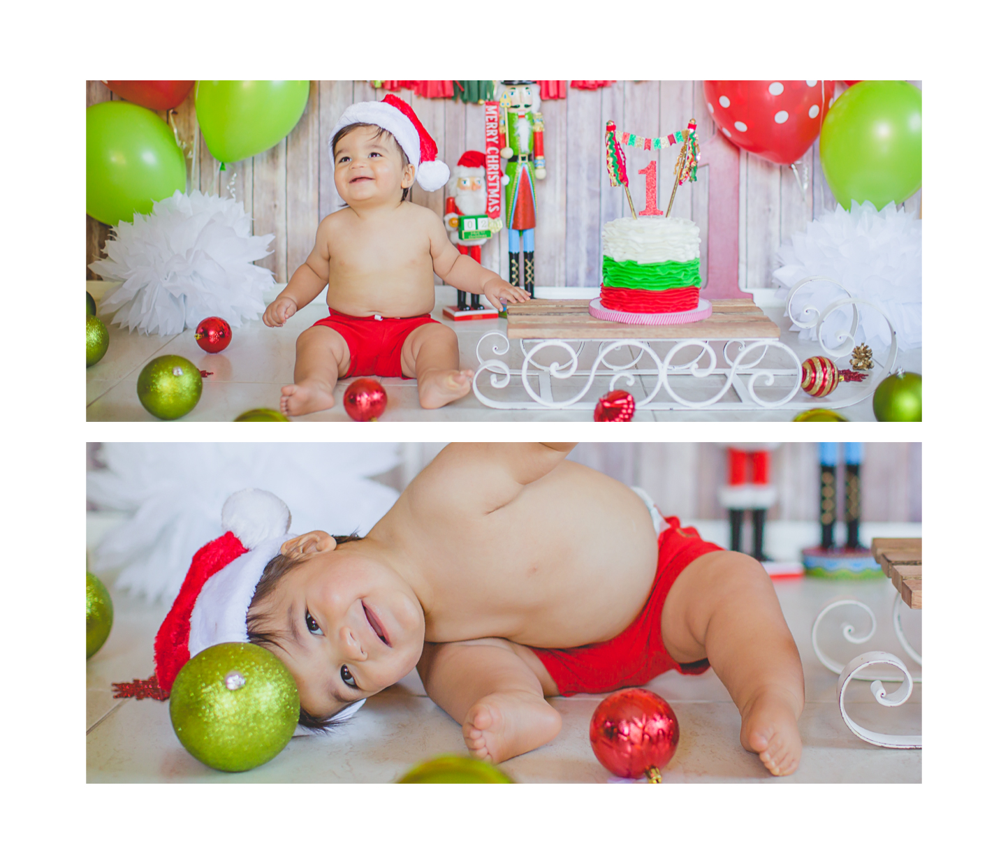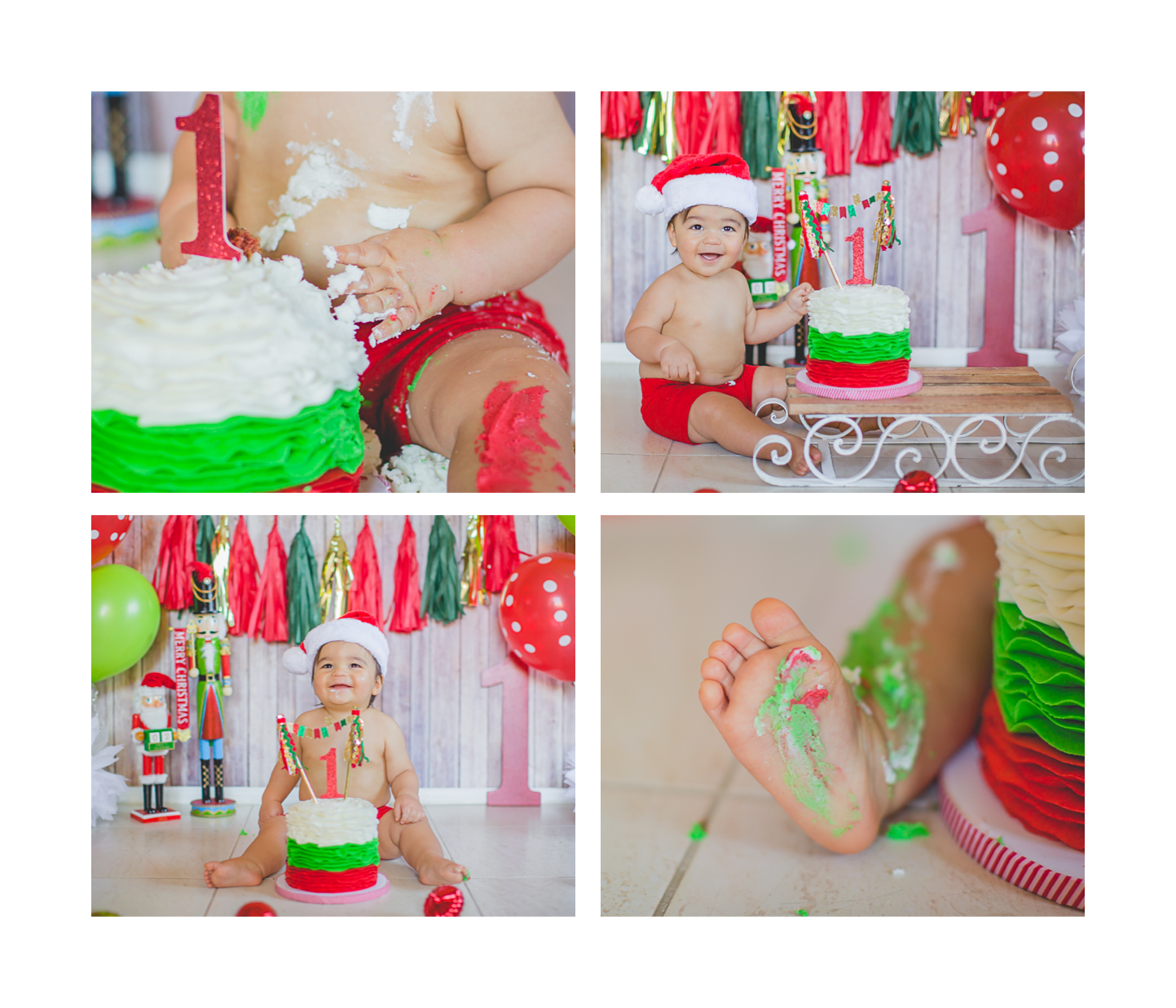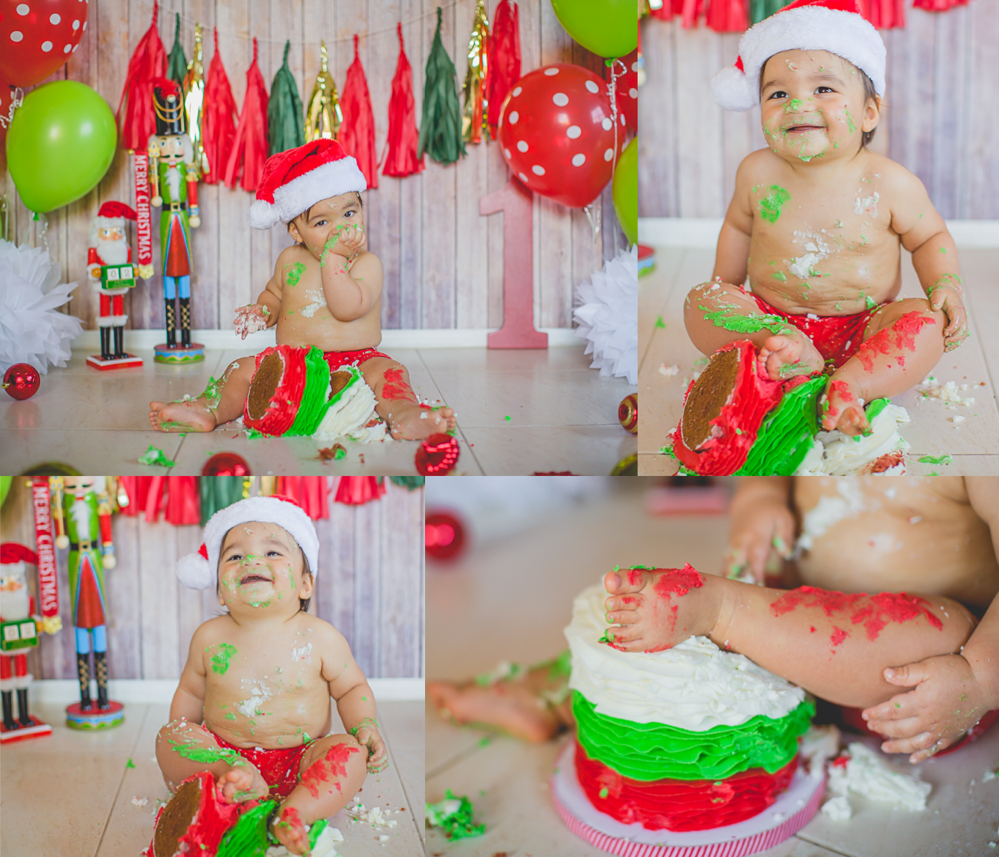 Nació hace poco más de un año, en navidad, así que su mami quiso que el tema de su Smash the cake, fuera navideño. Súper original y colorido, además Matthew no se movió de su lugar y nos regaló muchas sonrisas lindas… es muy fácil este trabajo con bebés así